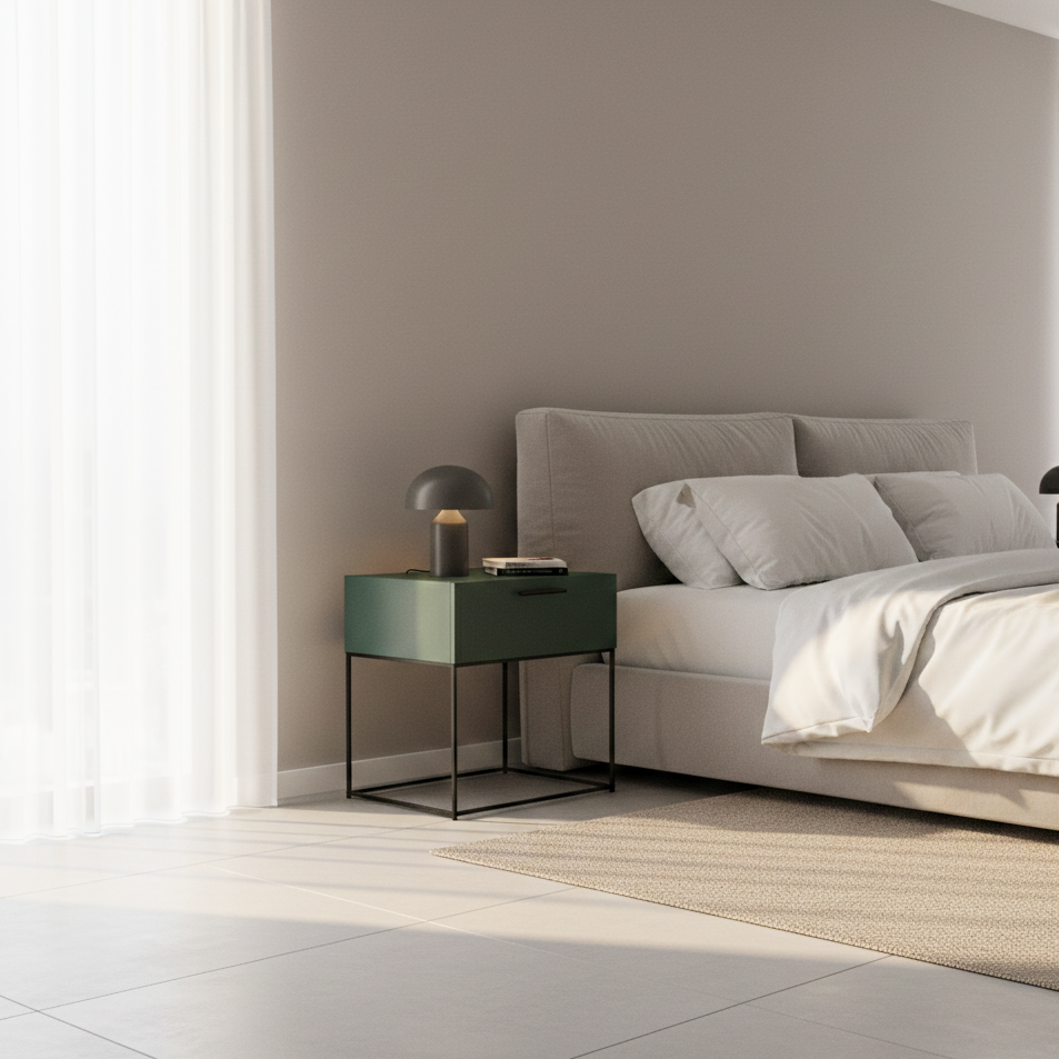 Carries the same grounded presence into the bedroom, quietly confident. Designed to keep the essentials close, without visual noise.